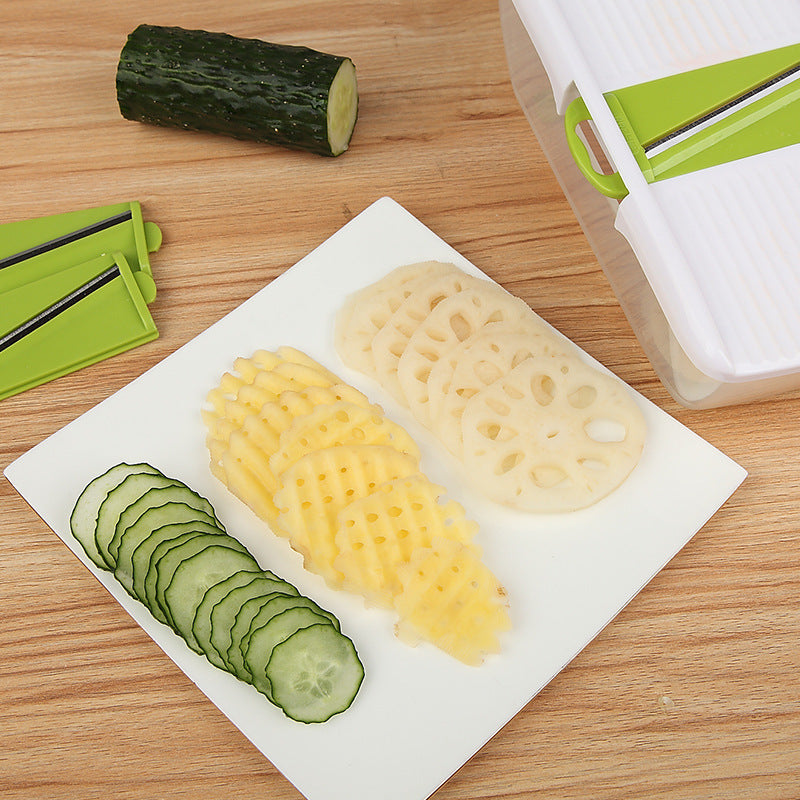 Make meal pre fast and efficient with this 6-in-1 Multifunctional vegetable cutter, allowing you to dice, slice, and grate a variety of vegetables such as potatoes, radishes, and more.