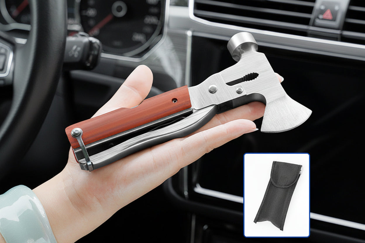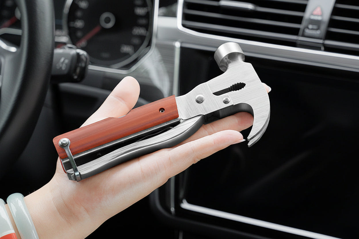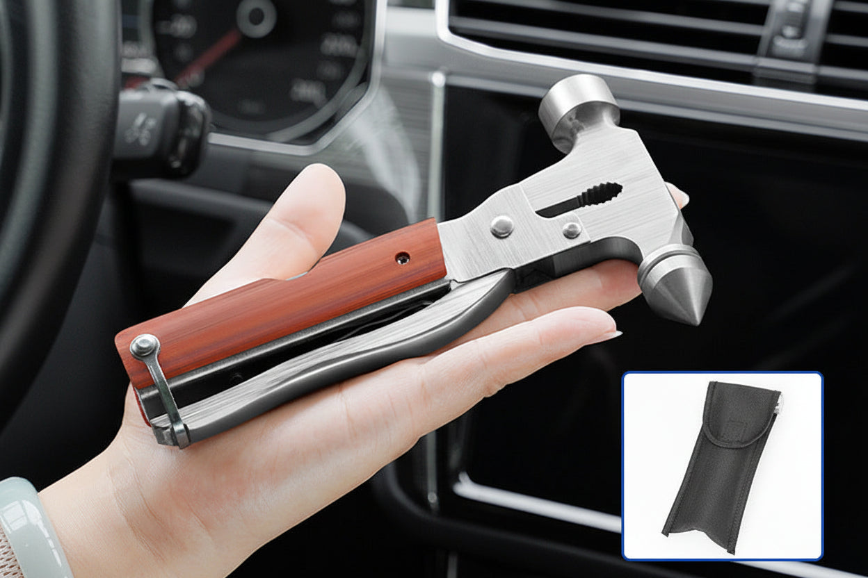 This multi-functional tool features a pointed hammer for breaking windows and a pry-style edge that can assist with cutting seatbelts or prying when needed. Its compact size makes it easy to store and access in your vehicle.